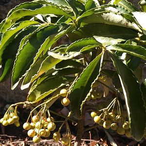 『寿ぎ』『財産』『金満家』『徳のある人』。「寿ぎ(ことほぎ)」「徳のある人」は、お正月の縁起物として飾られる赤い実にちなみます。「金満家」は、実が熟してもなかなか落ちない様子に由来するといわれています。花期は7~8月です。