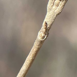冬芽葉痕 シソ科ムラサキシキブ属の落葉低木 日本各地の林などに生えています。 晩秋にはこの姿になって葉や実に隠れていたのが、この時期になって目立ち始めました。 小さな冬芽は大きさ8mmほどの裸芽に短い柄が付いています。 短い柄の上に天使の羽🪽🪽が生えているみたいに可愛かったです🥰 左右に開く葉2個が外側にあり、 前後に開く葉2個が中央に重なって見えています。 裸芽ですから太い縦の主脈と斜めの側脈があり、表面には短毛が密生しています。 葉痕は半円形~ハート型🩶 横長の維管束痕が1個あり・盛り上がっています♪
