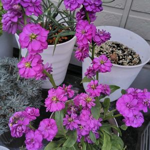 ストック ・今日のお花 寄せ植えです もう満開状態❣️ ・ジンチョウゲ 花芽が見えてきました 🫣 今から今年初のイチゴ🍓狩りに行って来ます🤗