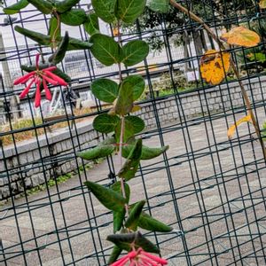 慌てて 10月半ば の 写真を投稿しています。 ツキヌキニンドウ 突抜忍冬 英名 コーラル・ハニーサックル トランペット・ハニーサックル スカーレット・ハニーサックル スイカズラ科スイカズラ属常緑つる性低木 アメリカ東部原産 お名前の由来は、 花序の直ぐ下の対生する葉っぱが合着し、葉っぱの中心から茎が貫くように生えている様子を「突抜」と表し、 冬も葉がしおれず耐える常緑のスイカズラってことから「忍冬」と、付けられました。(近縁のスイカズラは落葉樹ですね) 1つ目 こんな かわいい 色変わり中の果実を見っけましたよ。 茎が葉っぱを貫いてるように見えますね! 2つ目 果実は 5〜6mm位の液果 熟すると明るい赤色になります 美味しそうに見えるけど有毒なので、人は食べられません。 毒が平気な鳥たちは食べて種子を運んでくれます 3つ目 花期がけっこう長く、5~10月なので、10月半ば お花と果実が同時に見られました。ラッキー 長さ4~5cmの細い筒形のお花は、虫たちに大人気で 蜜源 になっているそうです。 なるほどね!ハニーサックル! 撮影 2025 10/12 小石川植物園 ★ 食べて遠くへ運んでシリーズ