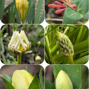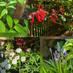 🏷️金曜日の蕾たち 参加します ↖️ ジャーマンアイリス(ドイツアヤメ) ↗️ 突貫忍冬(ツキヌキニンドウ) ⬅️ シャスターデージー ➡️ シラーベルビアナ(オオツルボ) ↙️ ジャーマンアイリス ↘️ クリスマスローズ(寒芍薬) 小庭及びカーポート下 26.04.17