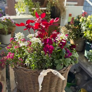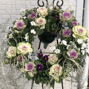 葉牡丹のハンギングが華やかです。今日の花ストック、うつむき加減のクリスマスローズ、柔らかな色のシクラメン、どれも優しい色合いで穏やかな気持ちになります。