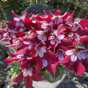 冬の寄せ植え、ダブルデッカーです。 赤系の花に白のアクセントでまとめてみました。春には背の低い赤いチューリップ🌷が4本咲く予定です😄 このシクラメンのタイプは初めてです。机の上に置くライトみたいに見えて面白いです。
