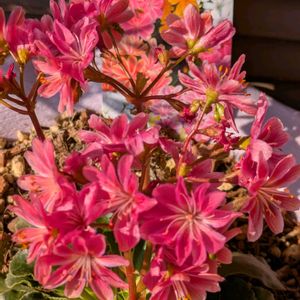 新宅の2階で ピンクのレウィシアの花が咲き 朝もや昼は励まされ、夜は疲れを癒やします❗