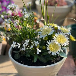 こんにちは♪ 予報通り雨は止み少しずつ晴れ間が出てきました⛅️ 昨日作った寄せ植え(昨夕の撮影) 白いスミレが清楚で素敵だったので白いフェリシアとホワイト&イエローのオステオさんと一緒に😊 今季の寄せ植え(そう言える程のものでもないですが💦)は10個目🎉 少し前にも白系を作ったけど、白の水仙がなかなか咲かないので…それまで白の代表になってもらいます🤭