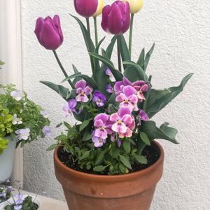 曇りや雨が続いてます… 降っていない時に撮った🌷寄せ植えを💜🤍❤️ 📷️ ①4/1 ②3/30(花束植えのダブルデッカー)