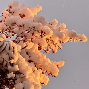おはようございます⛄️☀🎶 朝真っ白で驚きました🫢‼️ ①綿帽子のナンテンさん ②朝焼け🧡🎶 ③庭の様子が一変 ④玄関軒下組は大丈夫👌 ⑤ビニールハウス 間に合いました👌