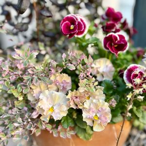 pic1 *パンジー シャイリーン *ビオラ シャルマンロゼ *セリ ピンクバリエガータ 冬の間、セリとシャルマンロゼに押しやられて枯れてしまうかと思いましたが、暖かくなったらしっかり咲いてくれました🥰 ほんのり優しいピンクがとっても癒される♪ pic2 *オステオスペルマム ピンクアイビューティー 数年前から育てている株です。 初めは花壇に植えていましたが、どうも調子が悪くなり、スリット鉢に植え替え。 今年は見事に咲いてくれました🌸