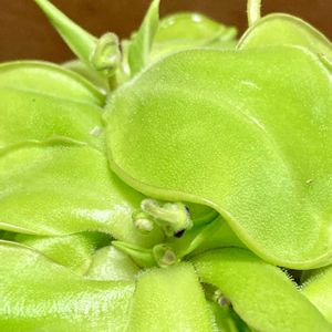 皆さま、こんばんは🌇 11月18日に投稿している、 ムシトリスミレのその後です。 とても、謎の ムシトリスミレです。 今年の6月にヤフオクで 落札、 Pinguicula spec koehres の名札がついていて、 ピンギキュラ ケーレスだと思っていたら、花が! 全然違う花でした。 (気になる方11月18日の投稿を見てください) しかし、なんか、とても、 面白いムシトリスミレで、 この寒い、虫のいない時期に、なぜか? 虫を取る体勢が万全なのです? 5枚目写真 (観覧注意!) 一匹だけ、虫を捕まえてます。 葉の表面には、写真に写るぼどの、ネバネバの粘液がたくさん出てます。 寒いから、虫はいないのにね😆