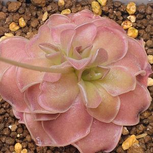 Pinguicula 'Aphrodite'の横顔(1枚目)、正面(2枚目)、近況(3枚目)。 冬なので株が縮んでいますが、気がついたら3姉妹(?)になっていました。気温が上がってきたら、水やりを増やしていきます。虫をよく捕るため鹿沼土だけでよく育ちましたが、今後の成長が楽しみです。