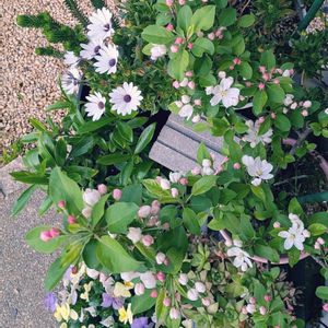 おはようございます。 ヒメリンゴの花が咲き始めました。 風が強かったので、転倒予防で、ブロック置いてたのが見えてますね(^_^;)💦 今、先祖戻りの挿し子は、葉にスジが出てて素敵。 パワーバランス崩れて来てて⋯⋯エケベリアや、ディコンドラは、救出かな〜。