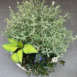 昨年秋に寄植えした3種。 現在の様子です。 弱々しく見えたシレネ ですが、冬の間も勢力拡大してました。今、たくさん蕾が出来てます。写真ではわかりにくいですが、鉢から溢れて地面に到達しそうです。 当初の予想は「アジュガがモリモリになって他を圧倒」だったのですが、違いました😆 ホスタは地上の葉は一度枯れましたが、今月に入り新芽が出てきました。 (2枚目は、昨年10月の再投稿です。)