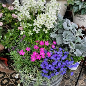 玄関先の寄せ植えをリメイクしました🌿 リナリア🤍やロベリア💜がモリモリに満開に✨❀✿🌿 挿し芽っ子のシレネ🤍も咲きだしました🤍🌿 ご近所さんに頂いたシレネ・ピンクパンサー🩷が目を引きます✨🌸🌿