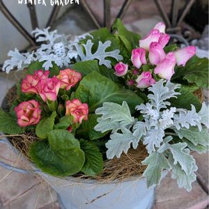 1⃣ バラ咲き プリムラジュリアン ꕤプリン🍮アラモード ꕤブライダルベール 🌿.∘シルバーリーフ 2️⃣ ꕤマスカットの ジュレ チェッカーベリー❤️ 🌿.シルバーリーフ 毎年恒例で‥ ブリキ缶の鉢で 仕立てました