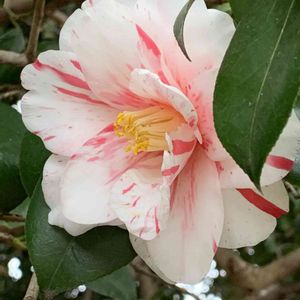 おはようございます♪ ♡今日のお花♡ 💖椿(ツバキ)💖 宝合(タカラあわせ)…白地に縦の紅の絞りが入る椿です