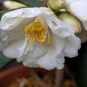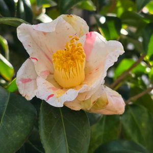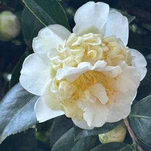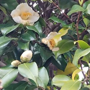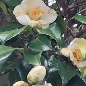 おはようございます♪ 散歩道に咲いてます 🤍椿(ツバキ))🤍 ブラッシュフイールズイエロー? ツバキ科ツバキ属 常緑高木 唐子咲きの中輪洋種ツバキ