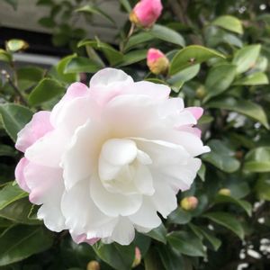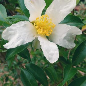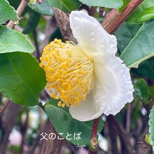 植えた覚えのない、サザンカ🤗 鳥からのプレゼントかな⁉️ 花びらの細めな、清楚な白い花🌼