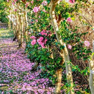 おはようございます。 サザンカの並木道を散歩しました。花びらが散り、ピンクの絨毯の様でした🩷