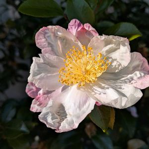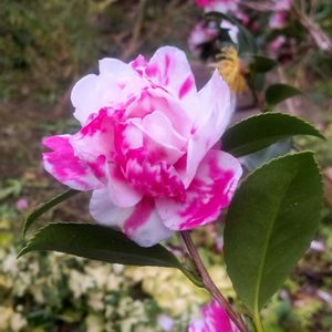 サザンカ散歩🚶 花びらに複数の色が混ざっている 品種を[絞り]と言うらしい あっ[絞りのサザンカ]見っけ🩷