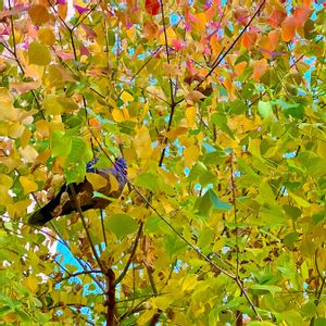 初冬の散歩道、頭上のナンキンハゼの中から視線を感じました! (‥見上げたら〜〜→ ₍ᐢ.ˬ.ᐡ₎ .ᐟ🐦のおしり🤣隠れてるつもりかな?) 先週まで黄緑だったナンキンハゼの葉っぱは、 🌈虹色のグラデーションになって空に広がってました🍂 これから、落葉樹は冬を迎え、枝にとまる鳥の姿を見せてくれる季節に移っていきますネ∧( 'Θ' )∧ 冬の楽しみ♡