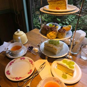 ホトトギス アフタヌーンティーに娘と来ています イチジクとシャインマスカットのケーキ 大好きな😆💕スコーン 紅茶は紅葉狩りとローズ&バニラ 座席はお気に入りの庭が見える場所で 仲良しリレー l love the Earth. に参加させて下さい