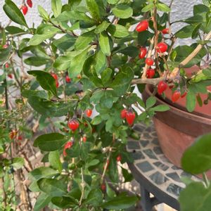 クコに 可愛い💓〜 つやつやの 実🔴が なりました〜❣️ ほかの季節には、見向きもされず、 放ったらかしにされますが、今の時期だけ 注目されるクコ🔴です‼️ そのクコ🔴に 野鳥のお客さんが 来るのでした...... 食べてるのは誰か ⁇ 分からなかったのですが、ある日 ハッキリ 目撃したので、分かりましたよ、ジョウビタキさんでした💓 2枚目は ブロックに 閉じ込めてるトクサです〜‼️ 好きで 買って来たのでは無く、 引っ越して来た時から 有って、前の住人さんが 植えていたもの....... 可哀想〜だから 引き続き、育てていますが、、、それが 大変なんです〜、トクサ🌱の生命力なんです‼︎ どう〜やって 飛ぶのでしょう〜💦 離れた所からも ボコボコ生えて来て 繁殖します。。。 結構 困っていますが、没には出来なくて 付き合って、お世話しています〜❗️😳