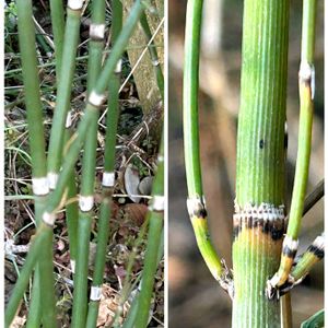 シダ植物色々🌿🌿🌿 1️⃣トクサ(砥草)(木賊) トクサ科 同属 別名 ハミガキグサ(歯磨草) 山地のやや湿った場所に生育する 常緑性の草本で、夏に茎の先端につくしのような胞子嚢穂をつける 地中に地下茎を伸ばし、茎は直立し、スギナのような分岐はないが、稀に短い側枝を出す(写真は分岐したもの) 葉鞘である節から茎はすぽっと抜けて、中は空洞である 森の中の池周りにありました トクサの表面にはケイ酸が含まれ、ザラザラしており、昔から木工品や爪、歯を磨く天然のヤスリとして利用されたので、砥(と)ぐ草=砥草と呼ばれる 十草と書くと、お茶碗や湯呑みの縦縞模様の絵柄で、真っ直ぐに伸びるトクサがモチーフになっており、縁起物だそうです 2️⃣園芸としてのトクサ 縁起物の植物①真っ直ぐに伸びる姿が成長や繁栄を表す ②乾燥させたトクサで金を磨くと光沢が増す事から金運を招く 3️⃣イヌドクサ(犬木賊)(接骨草) トクサよりは一回り細い 河川の近くの土手下草むらで7月 4️⃣ノキシノブ(軒忍) ウラボシ科 ノキシノブ属 木の幹や石などに生える細長い葉のシダ。 葉の裏に2列の胞子嚢群をつける 木に寄生している訳でなく、すみかにして光を独占している かつては民家の軒下に生えていて、過酷な環境から耐え忍ぶからこの名前がついた 5️⃣イノモトソウ(井之許草) イノモトソウ科 同属 名前の由来 井戸のそばによく生えていた事 人家近くから、山地の林縁に生える 栄養葉と胞子葉があるようです 葉軸に翼があります