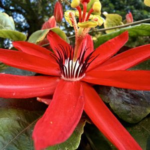 加西フラワーセンターで見た珍しい植物 以前行った時は咲いてなくて。 どんな花が咲くのか楽しみにしてました。 蕾見つけました❣️ 咲いたら10センチ〜12センチのトケイソウの花が咲くようです ツルはとても太く天井まで届いてます 果実は甘くって美味しいそうです