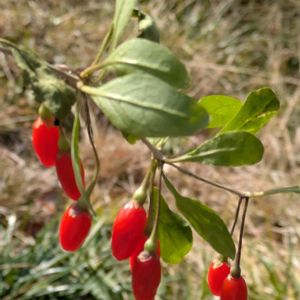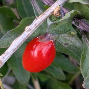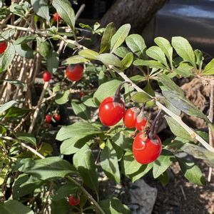 クコ 橋の下に赤い実が鈴なりになっている 真っ赤な火曜日🏷花の時期には全く気づかず、土手の周りがすっかり枯れたおかげで目立った赤い実🔴 少し刈り取って持ち帰り、実を潰してみると、中には粘液に包まれた種が20粒ほど入っていた💛 稜のある短枝には葉が束生、長枝では互生している🟢 実だけでなく若い葉も茎も食用になるようなので、少し植えてみましょう♬
