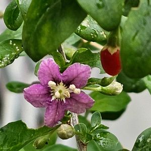 今日のお花💜枸杞 GSで枸杞の実のパワーを知り 小苗から育てています🌱 7月に花が咲き💜 10月に実がなりました🔴(2枚目) 生の実は美味しいとは思えなくて そのままにしていたら 🐦さんが全て食べてしまいました🥰