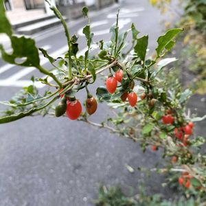 🏷️今日のお花 クコ 10月下旬に実家の近くの道端で見つけました🌸 毎週その辺りを見ていたけれど、今日まで実は見つからずでした😢 以前、コラージュで投稿したのと同じ写真です。 2枚目からは【番外編】です。 ②昨日のお月様とスカイツリー。 仕事から帰った夫が月が綺麗だよと教えてくれたので、外に出て眺めました🌝 同じ方向にスカイツリーも見えて、短時間で色が変わっていたので撮ってみました😊 近所から、上の方だけ少し見えます。 ③表参道のPRADA✨✨✨ 通りすがりにパチリ🤭