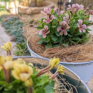 今日のお庭から。 売り場で可愛いペチュニア!と思って見たらペチュニアとカリブラコアの交雑種でペトコアって言うらしく、、気になるのでお迎え✨ 寄せ植えはしない予定だったけど思いつきで寄せ植えに☺️☘️
