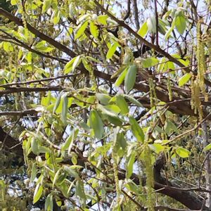 千葉市のゴルフ場の木です、芽吹いてきました。 よく見ると長い花なのか、10cm位の細い房がさがってます