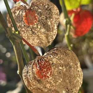 夕陽に照らされて 浮かび上がる 網目模様の複雑さに 魅せられました❁⃘*.゚ 残った実の鮮やかさが引き立ちます❤️✨️ 8月に実だけになった お値下げ品をお迎え🍀.* (前に見た虫ほおずきを じっくり見たくて探してました) 虫が食べてくれて 綺麗な虫ほおずきが出来ました✨️ ただ、ほおずきを食べてた虫が カメムシの仲間でした😑😂 てんとう虫だったら 可愛かったのに〜🐞💕