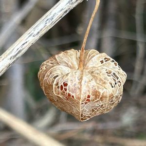地元散策で素敵なホオズキを見つけました。 中にまだ赤い実が入っています。 ホオズキは6〜7月に白色〜淡黄色の花を咲かせ、花後に萼が大きく膨らみ、中に赤い果実が入り、お盆には欠かせないホオズキです。 袋の内側の実にはたくさんの種子が詰まっているので、鳥や虫などに食べられないように、萼を広げ保護しているそうです。 刈られずにここで冬を越したようです。 袋をよく観察すると、筋状や網目状に通る筋があるのですが、これは葉脈で、まわりの葉肉よりも強くて腐りにくく出来てるそうです。 自然のなせる技で素敵なデザインのホオズキとなりました。 出逢えて嬉しいです🤗💕