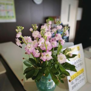 病院の生け花 直売所でピンク&ホワイトのスプレーストックを見つけました💠グラデーションカラーが目新しい✨️ 農業大学校の生徒さん作のようで、お値段も格安! いつも以上にラッキーな出会いを感じました😌💓