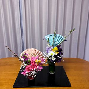 3月3日 男雛と女雛 大きく開いたピンク色の扇と背高くスマートな水色の扇で雅さを添えて、それぞれ色分けしたお花を入れてお男雛と女雛を表現。
