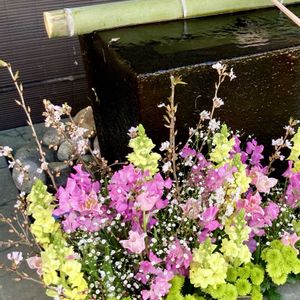 散歩道の神社 花手水舎のアレンジが変わってました💐 春らしい爽やかな色合いですね💐