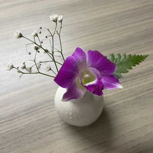 作家さんの花瓶にデンファレとレザーファン、カスミソウで彩り