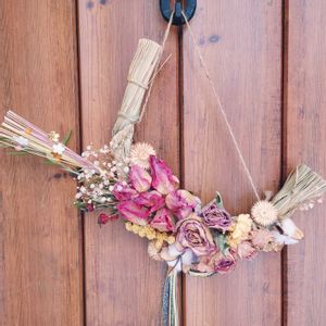 お正月用のしめ飾り、今年は三日月形…クレッセントリースとやらに初挑戦💪 春からずっと仕込んでいた、庭から摘んだチューリップのドライフラワーを使ったのも初めてでしたが…うん、まあまあボタニカル感が出たような気はします☺️