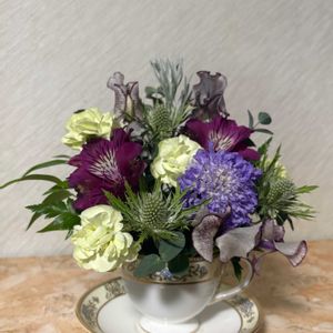 あまったお花でティーカップブーケ 大好きなクリブデンに… ☕️𝒩𝑜.26 クリブデン(Cliveden) 1990年〜1999年製造 イギリスの名邸宅に由来 アイボリー地に淡いブルーの花柄と優雅な金彩が特徴の人気の高い希少な廃盤シリーズ