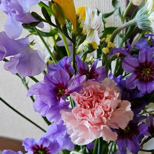 🏷️カラフルな火曜日 先日母の七回忌だったので仏壇のお花だけど仏花じゃなく春っぽいお花にしました💜🩷💛 🏷️青い花で春浪漫2026