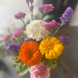 こんにちは☀️ くすみピンクがかわいいカーネーションと中心がピンクで周りが赤いバラです!🌹 切花で買ったので名前は分かりません😅