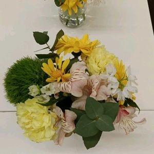 職場のお花達が傷んできたので、短くカットして庭の花達と一緒に瓶とマグへ生けてみる💛🧡 黄色パワーに癒される😊💛🧡