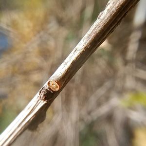 ツルウメモドキ(蔓梅擬)の冬芽 ニシキギ科ツルウメモドキ属の落葉つる性木本。 まだ実が残っていました。 つるは、はじめはまっすぐに伸びるが、他の植物があると伸びやかにからまりながら右巻き(S巻き)へ巻き登り、よく生長し他の木を覆うこともある。 花期は5 - 6月で雌雄異株。 葉腋から短い集散花序を伸ばして、黄緑色から淡緑色の数ミリ程度の小さく地味な5弁花が多数咲きます。 冬芽は半球形。 葉痕は半円。