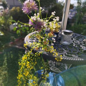 百均素材でデコレーション⁉️ 造花でガーデンテーブルとフェンスに ワンポイントつけてみた。 アリウム・カスミソウ・ゴールデンベル等々😆 雨が当たるので全部ビニール素材です😄 ちょっと遊び気分で…😁 by ブルお