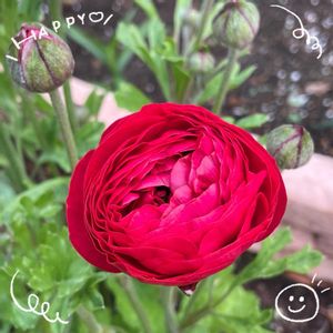 おはようございます😃 今日も皆さまにhappy〜💕 ①〜以前投稿した球根からのラナンキュラスは2つとも真っ赤か〜でした❤️😍 ③アリウムも咲いてきそう♬ ④〜クリーピングタイム💓お花がたくさん咲いてきました♬