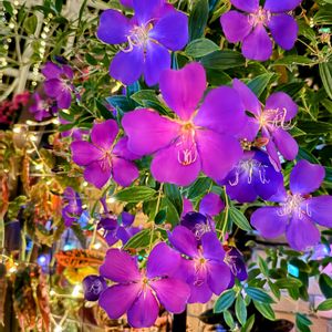 福井県立グリーンセンターの展示温室では日没からライトアップしています✨ シコンノボタンもライトで幻想的💜 ユニークなサンタさんもいっぱい❣️