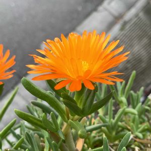 明け方までの雨もあがって 一気に晴れ間に 鮮やかなオレンジの花色 多肉質の葉 マツバギクの勢いを 感じます