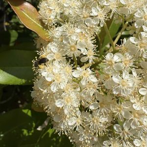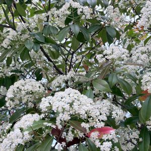 要黐(カナメモチ) もしかして🍁レッドロビンかな? 花の開花が早いのと葉の朱色が薄いのでカナメモチですね❗️ 調べてみてもよく分からないよ😭😭